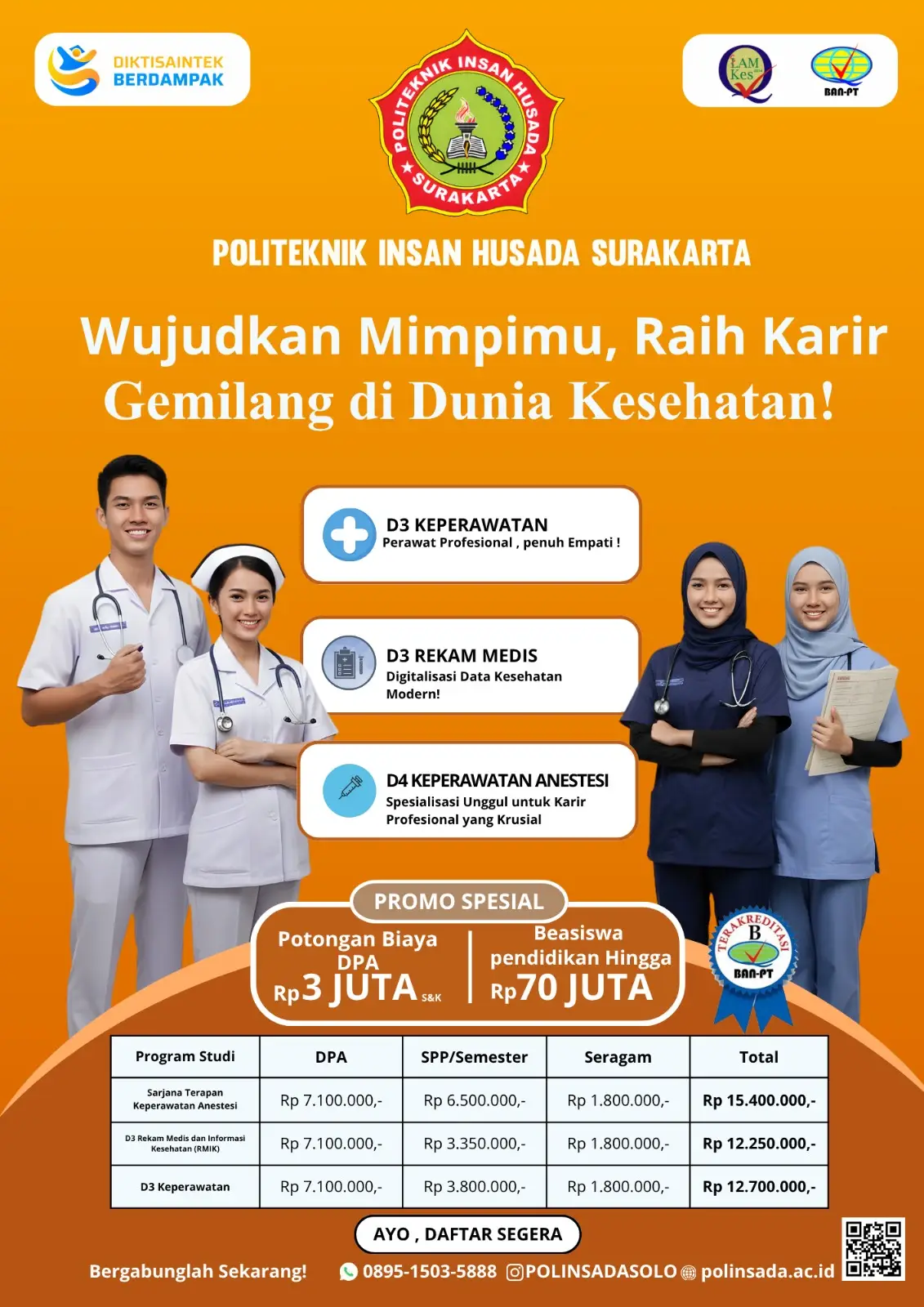 Kuliah di jurusan impianku? Mungkin hanya hantu di siang bolong, mengingat biaya kuliah selangit yang tak terjangkau. Hindari mimpi buruk itu dengan memilih jurusan yang tepat di Polinsada. Polinsada menawarkan jurusan yang paling dicari dari jurusan D3 Keperawatan, D3 Rekam Medis dan D4 Keperawatan Anestesi, TENTUNYA dengan biaya paling terjangkau dibandingkan jurusan yang sama di Tempat lain"
